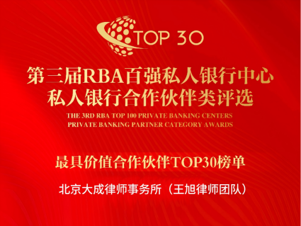 荣誉 | 北京大成律师事务所王旭律师团队荣登“第三届RBA百强私人银行最具价值合作伙伴TOP30”榜单