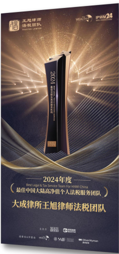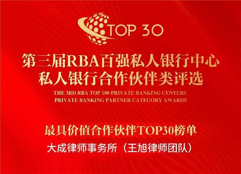 2023-2024年国际私人财富管理论坛上,大成律所王旭律师法税团队连续两年荣获亚太财富论坛“中国大陆最佳高净值人士法税团队”奖项。2025年,王旭律师团队凭借在私人银行领域的卓越法律服务和创新实践,荣登“第三届RBA百强私人银行最具价值合作伙伴TOP30”榜单。