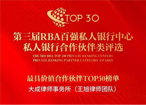 9月22日,由《零售银行》杂志社主办的“第三届RBA百强私人银行中心”评选结果正式揭晓。北京大成律师事务所王旭律师团队凭借在私人银行领域的卓越法律服务和创新实践,荣登“第三届RBA百强私人银行最具价值合作伙伴TOP30”榜单。