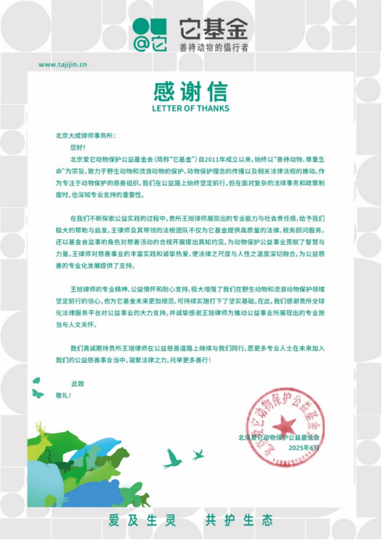 王旭律师的专业精神、公益情怀和耐心支持,极大增强了我们在野生动物和流浪动物保护领域坚定前行的信心,也为它基金未来更加规范、可持续实施打下了坚实基础。在此,我们感谢贵所全球化法律服务平台对公益事业的大力支持,并诚挚感谢王旭律师为推动公益事业所展现出的专业担当与人文关怀。