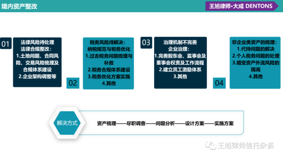 大部分中国高净值人士虽然拥有境外资产,但其核心创富板块仍在境内,境外资产板块的运营也与境内资产息息相关。因此,境内资产整改是跨境架构搭建的前提,也是跨境财富规划的第一步。通常而言,境内资产的整改包括境内企业的合规整改、境内其他资产的梳理及合规整改两大方面,具体内容如下: